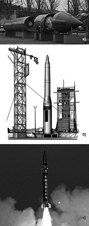 Самым крупным типом ракеты является баллистическая ракета дальнего действия, имеющая несколько ступеней с силой тяги двигателя первой ступени, достигающей 5000 кН и более. На рис.6 показана баллистическая ракета: в процессе сборки (а), на стартовой позиции (б) и полёте (в).