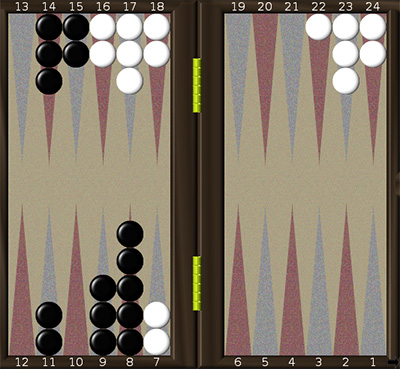 Например, рассмотрим позицию на рис. 1. В данном случае дом чёрных расположен в правом нижнем углу, дом белых – в правом верхнем. Пусть каждый из игроков ведёт собственную нумерацию полей, так что ближайшее поле в доме под номером 1, а самое отдаленное поле – номер 24.