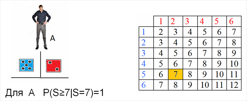 А видит оба кубика, поэтому для него множество возможных событий сведено к одному, и это событие является благоприятным, поэтому для него вероятность того, что выпало не менее 7 очков, равна 1 (рис. 3).